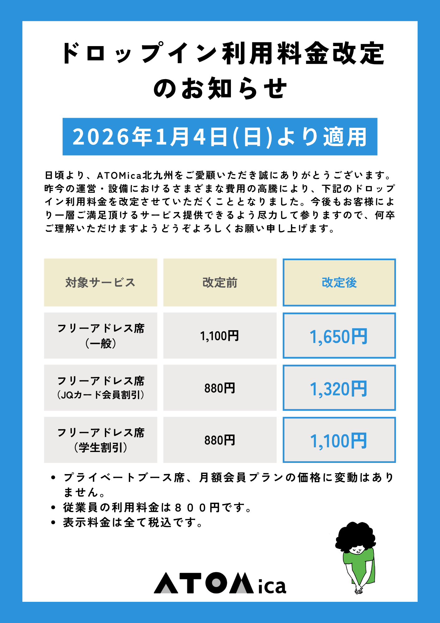 【重要なお知らせ】ドロップイン利用料金改定について(1月4日〜)