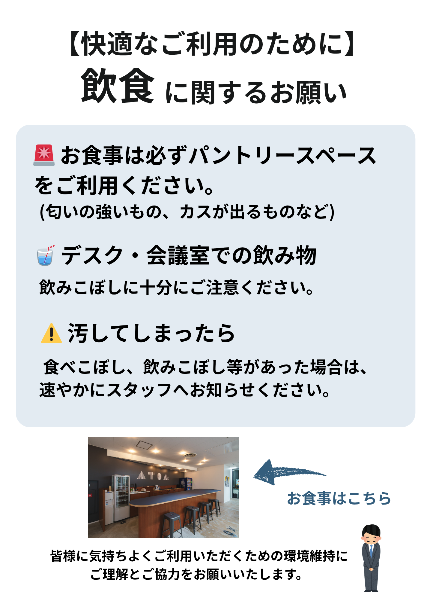 ▪️お食事について: 食事(においやカスが出るもの)は、必ずパントリースペースをご利用ください。