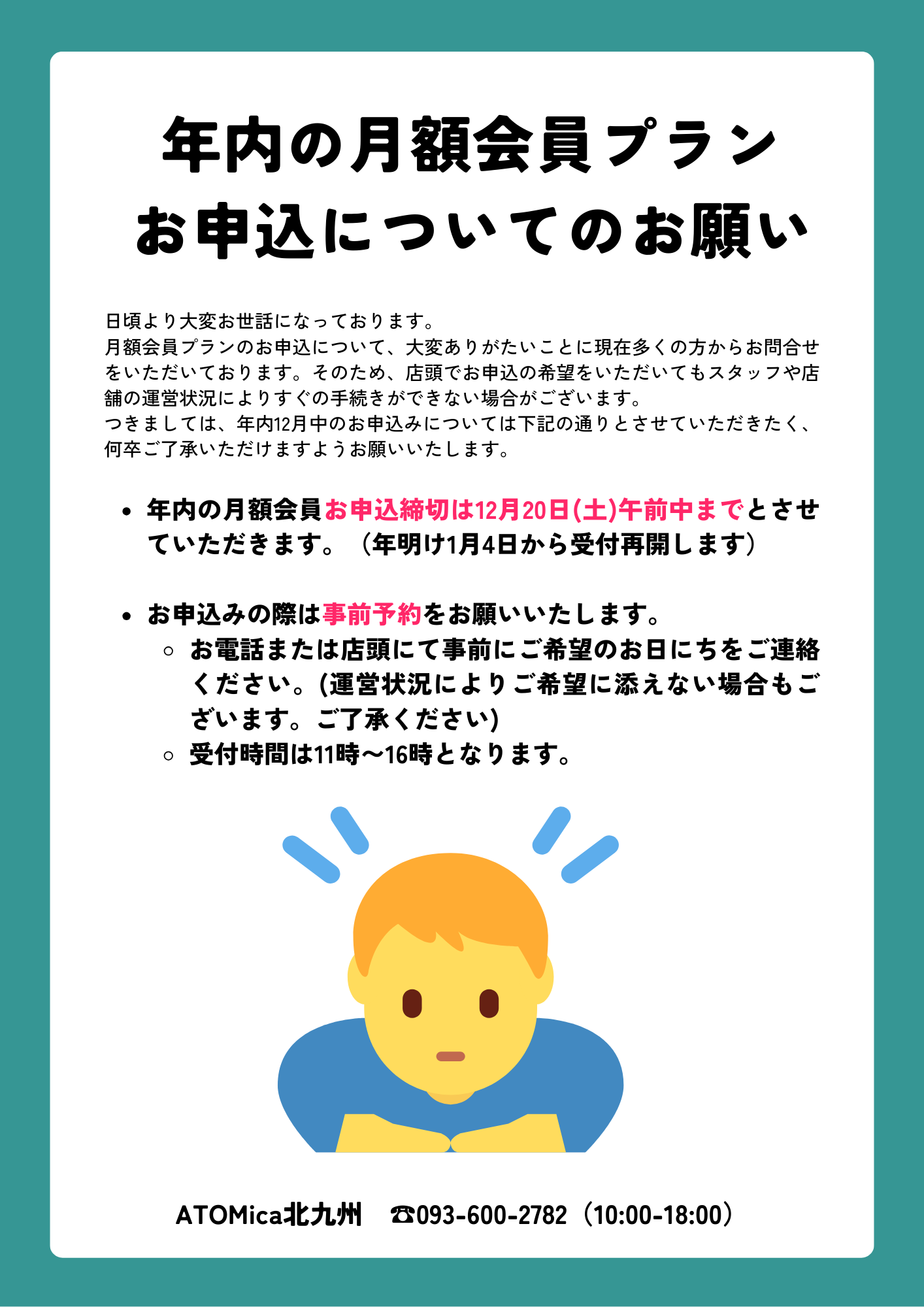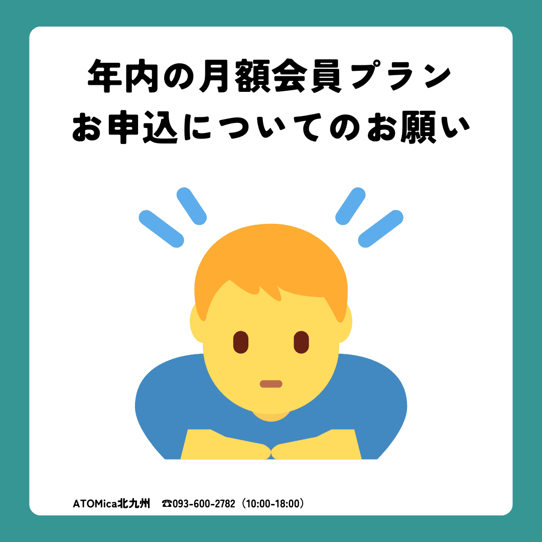 ATOMica北九州では、日頃より月額会員プランへ大変多くのお問い合わせ・お申し込みをいただいており、誠にありがとうございます。